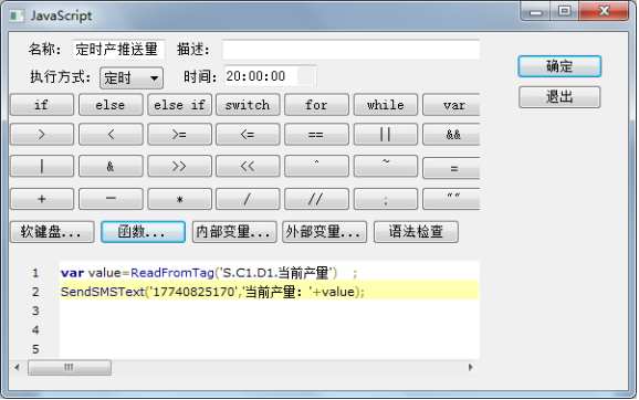 SendSMSText(x,y)函数是短信报警接口的调用函数。可以通过 SendSMSText(x,y)函数实现数据以短信形式定时的推送到指定手机用户。