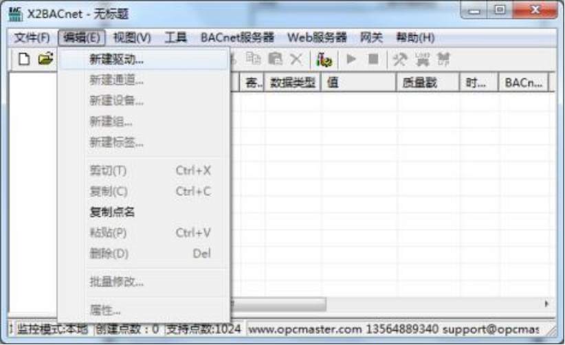 在上位机配置界面菜单栏选择“新建驱动”选项, 如下图: