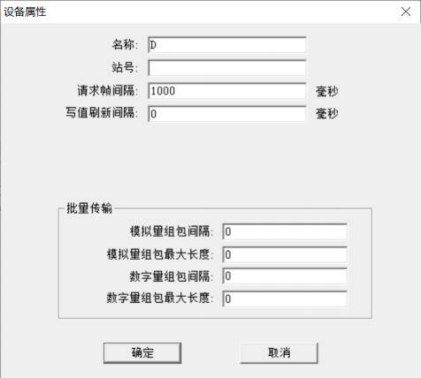 通道建立好后, 选择新建设备,在弹出来的对话框中设置设备相关属性,设备站号为 空,此参数无效。设备数据主动上报, 网关发送无须请求。 其他参数默认,如下图: