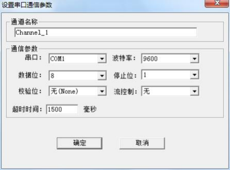 添加好驱动后, 选择新建通道, Lance_LTM8000 以 RS-485 通信方式通讯, 默认通道 为串口 1,默认通讯参数:9600bps,8,无校验位, 1 个停止位,默认超时时间 1500 毫秒, 在配置时, 如果设备响应比较慢,超时时间尽量设置长一点, 如下图 。注意超时 时间是指主站请求帧的等待超时时间。