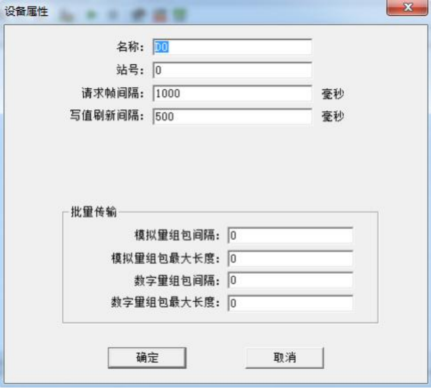 通道建立完成后,选择新建设备,在弹出来的对话框中设置设备相关属性, 设备默认 站号为 0,站号对应采集模块的设备号(范围 0~255),请求帧间隔为 50 毫秒,该设备不支 持组包,可将组包参数设置为 0,如下图 。注意请求帧间隔是指发出下一帧请求与 上一帧请求之间的时间间隔。