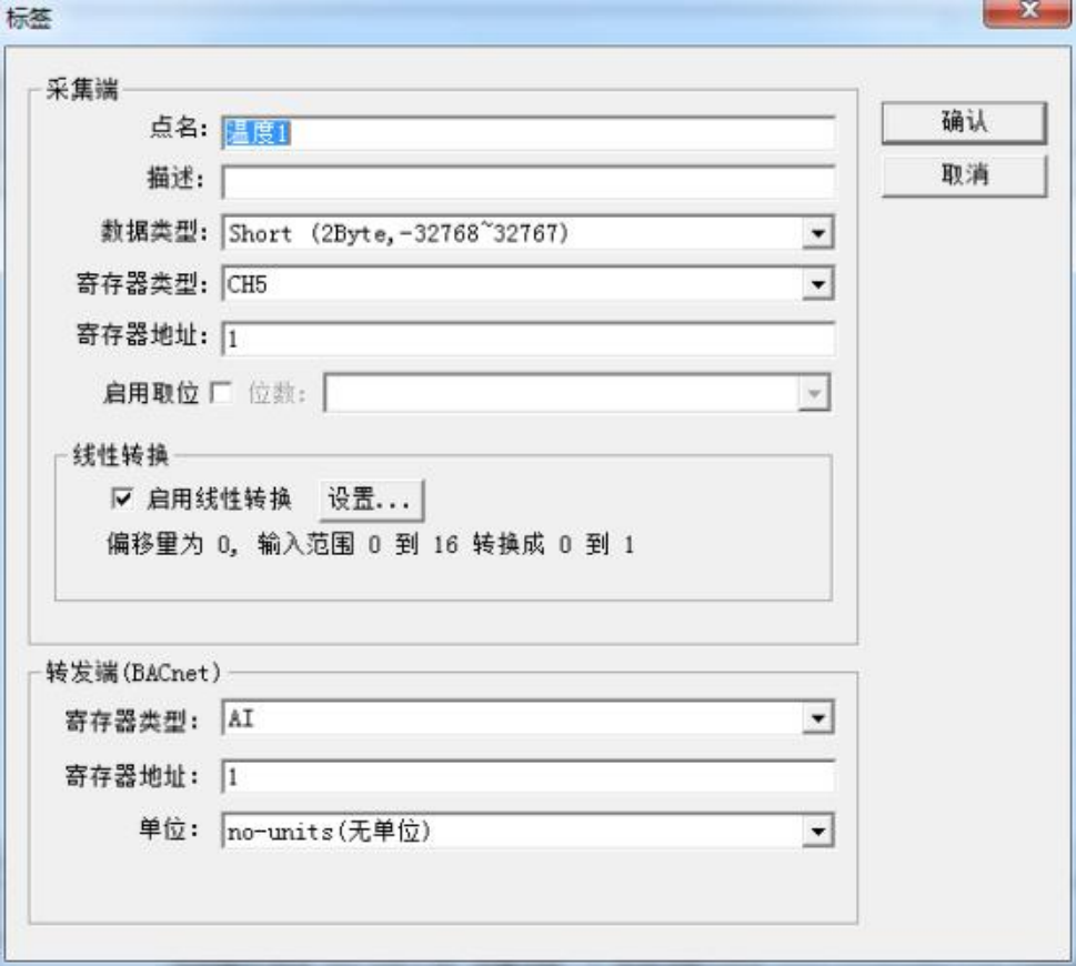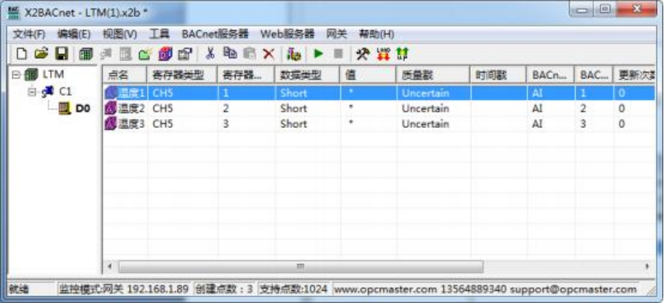 注意: 以上 Tag 属性中, 转发端 BACnet 从站寄存器基地址可以从 0 开始分配。标签 建立完成后如下图: