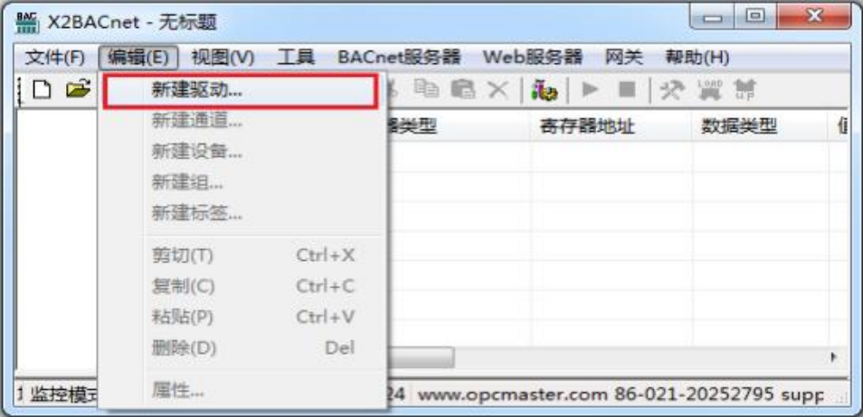 在上位机配置界面菜单栏选择“新建驱动”选项, 如下图: