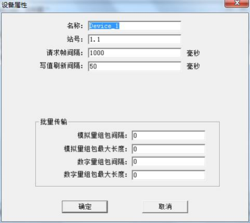 通道建立好后, 选择新建设备, 在弹出来的对话框中设置设备相关属性, 设备站号由 主地址和副地址两部分组成,格式为 M.N,设备默认站号 1.1,请求帧间隔为 50 毫秒。 如果设备不支持组包,可将组包参数设置为 0 即可,如下图。注意请求帧间隔是指 发出下一帧请求与上一帧请求之间的时间间隔。