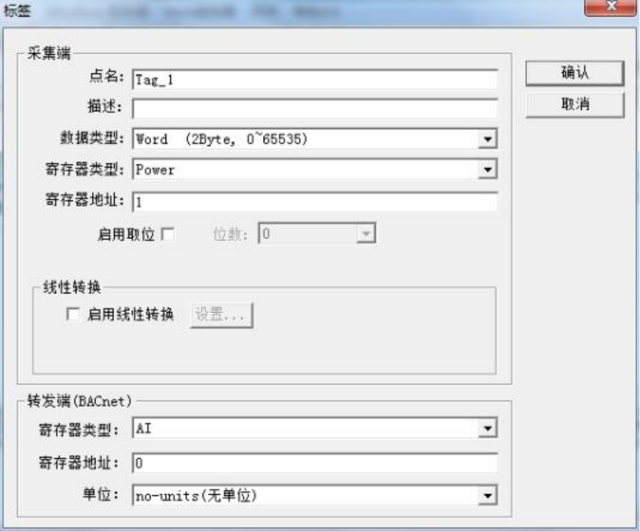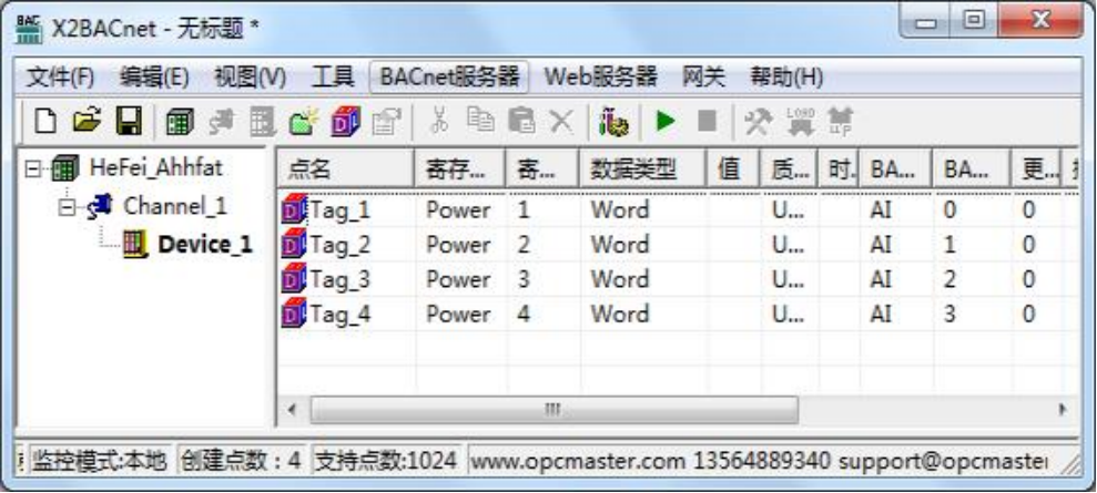 注意: 以上 Tag 属性中, 转发端 BACnet 从站寄存器基地址从 0 开始分配。标签建立 完成后如下图: