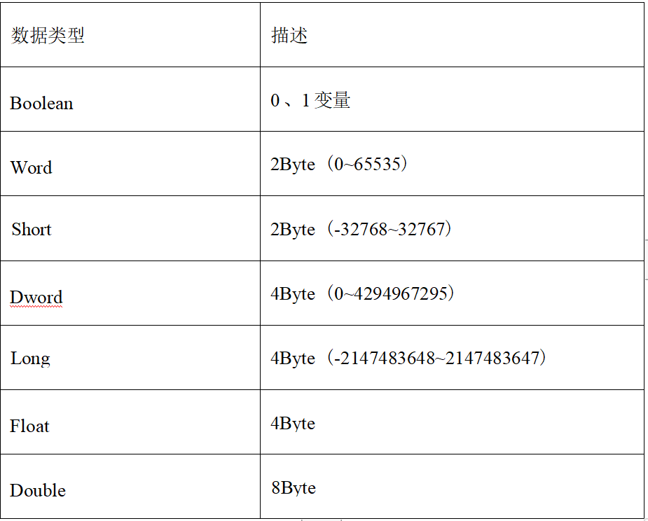 采集端支持的数据类型有:Boolean 、Word、Short、Dword、Long 、Float、Double;具体描述如表 所示: